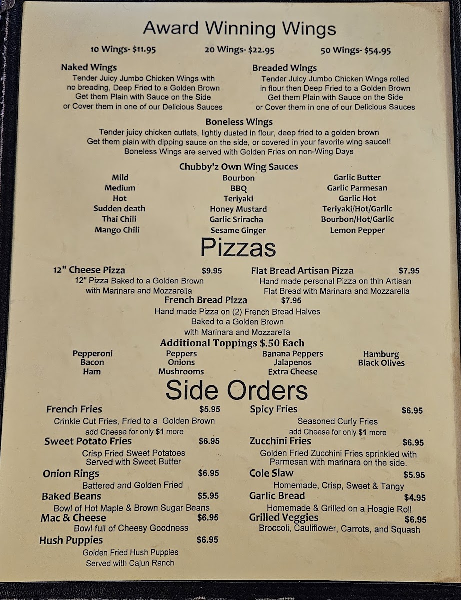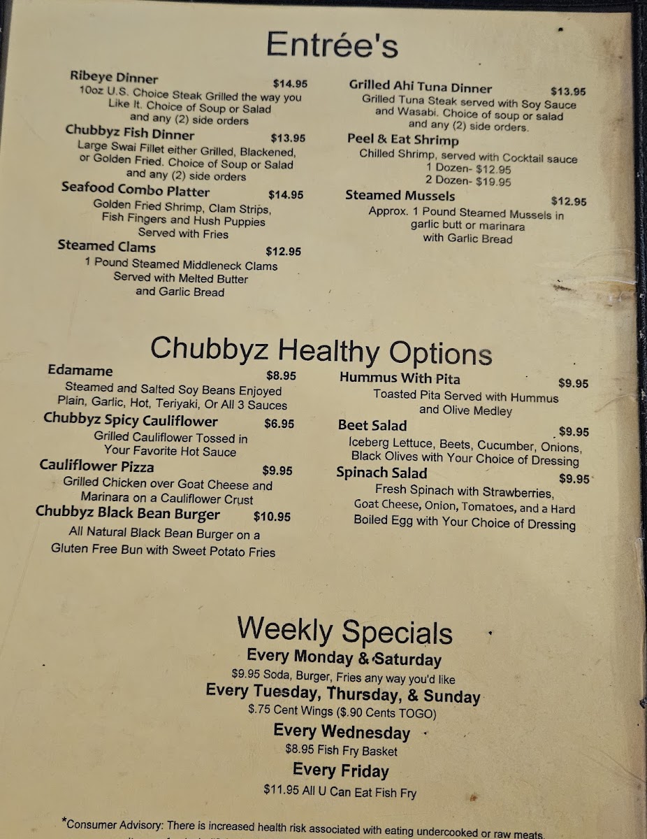 The restaurant also shines with its appetizers and drink specials, especially during happy hour, ensuring your experience is both delightful and budget-friendly. With attentive service and a welcoming ambiance, Chubby'z promises a memorable dining experience that keeps patrons coming back for more.